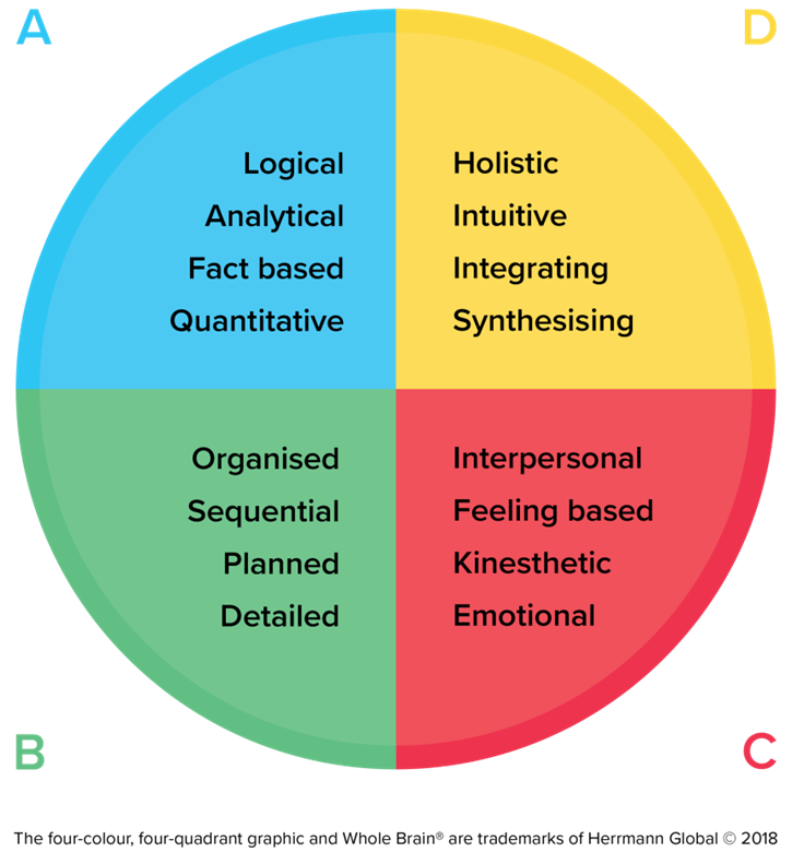 Whole Brain Thinking, rooted in the Herrmann Brain Dominance Instrument (HBDI), maps thinking preferences into four quadrants.